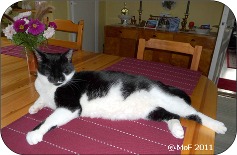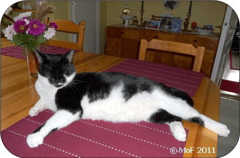 På skoj gav jag henne ett par gojibär för ett tag sen. Dom gillade hon skarpt, så nu får hon några varje gång hon är på plats. Om det stämmer att katter aldrig sätter i sig sånt som är skadligt för dom, tar jag det som bevis på att dom är lika nyttiga som det påstås. 🙂