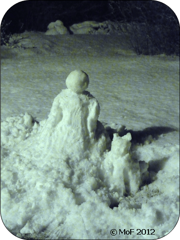 Gårdagens blötsnö inspirerade till snöstatyn föreställande husets invånare. När den var klar halshögg Mia mig, men som tur var det enkelt att fixa ett nytt huvud. 😀