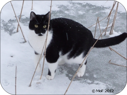 För att roa henne grävde jag bort snön så hon kunde ta sig in under båten för att undersöka. Det var inte värst intressant så vi gick tillbaka upp till huset efter en stund. Den här gången höll hon sig bakom mig och följde mina upptrampade spår. Smart kisse.