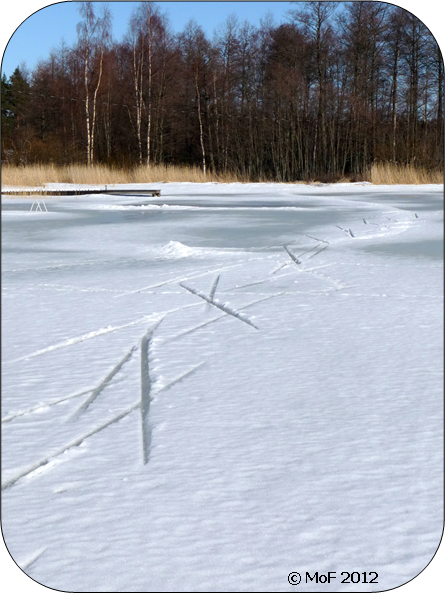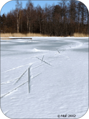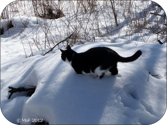 Tyvärr håller inte skaren längre. Det var bara magen som hindrade Mia från att försvinna ner i snön då hon skulle smyga på en blåmes som satt i vassen.