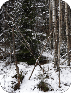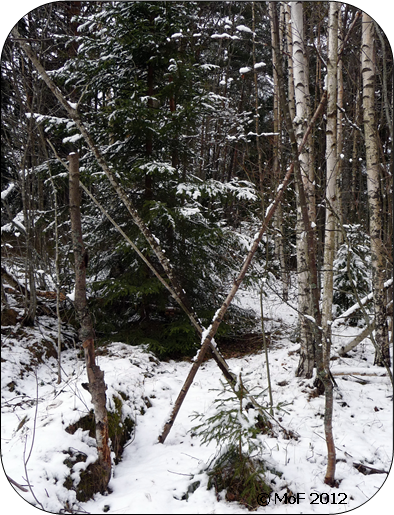 Strax innan jag såg ett bekant hus skymta mellan träden mötte jag ett hinder. Inte så mycket fysiskt som symboliskt. Två klena trädstammar utgjorde ett kryss, vilket jag uppfattade som en tydlig signal om förbjudet tillträde. Fråga mig inte varför, det bara kändes så.