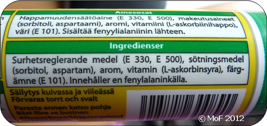 I onsdags fick jag för mig att det kunde vara bra att ha lite extra C-vitamin hemma. Jag blev lätt chockad då jag läste innehållsförteckningen på tuben. Varför fortsätter man använda konstgjorda sötningsmedel trots att dom är skadliga? Färgämnet verkar också överflödigt.