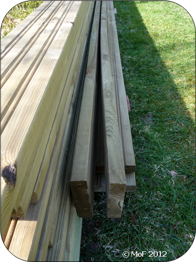 Jag kunde ha besparat mig besväret. Dom var redan ”slagna”. Mitt ex (som är sågverkstekniker) skulle aldrig godkänna den kvalitén, men förmodligen är virket så fuktigt att det ändå går att få till. Ägaren på Varutjänst tipsade mig nämligen om att lägga bräderna kant i kant ”för till midsommar har dom ändå krympt så mycket så det blir lagom stora springor”. Det är priset man får betala för billiga inköp.