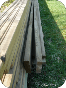 När jag kom hem från macken låg bräderna prydligt staplade på gräsmattan och trappmöblemanget stod intill. För att bräderna inte ska ”slå sig” innan bygget blir av, hämtade jag några gamla taktegel som underlag och radade om dom.