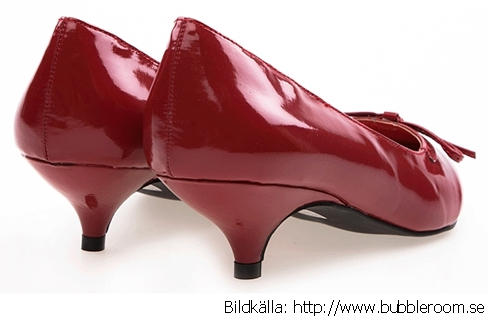 För att pigga upp intrycket tyckte jag det kunde sitta fint med röda skor. Jag visste att jag har ett par med lagom låg klack och hittade asken på direkten. På kanten står det nämligen ”Nya röda m taxklack” för att skilja dom från ett par andra röda.