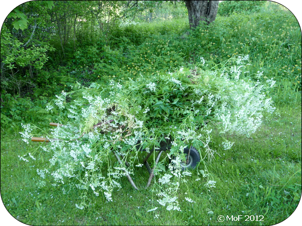 Jag har fått för mig att hundlokorna inte behöver växa runt det gamla äppelträdet. Tack vare regnet som gjorde marken mjuk var det ganska lätt att få upp dom med rötterna. Men nästa år är dom säkert lika många.