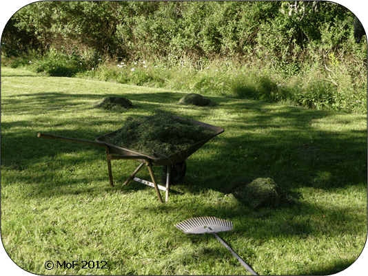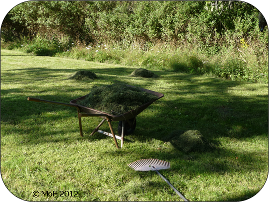 Gräshögarna och skottkärran fick vänta medan jag drack eftermiddagskaffe hos mina grannar på udden mittemot. Men nu ligger allt gräs på ”bryggstigen” för att bli ny jord så småningom.