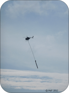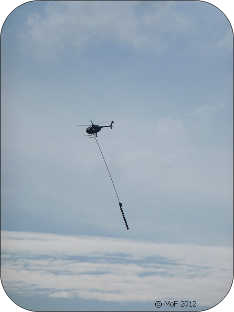 Efter det stod borstspirean på tur. Dels var det dags att plocka bort blommor som vissnat och dels ville jag ”frisera” den en del. Medan jag höll på med det inträffade det enda spännande som har hänt på hela dagen. Fortums ”såghelikopter” flög förbi och röjde ellinjen på andra sidan sjön.