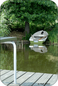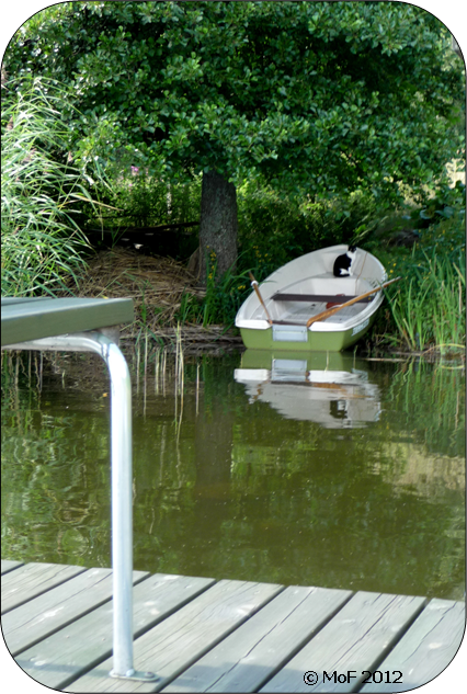 Idag parkerade hon sig i roddbåten. Igår bytte jag nämligen förtöjnings­plats för att slippa brottas med vassen och i och med att båten nu låg delvis på land tyckte hon tydligen att den var säker att beträda. Tidigare har hon aldrig gått ner i den.