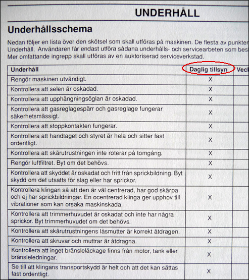 Idag fick jag den svenska versionen med posten och har än så länge bara tittat på avsnittet Underhåll. Det gjorde mig helt matt. Varje dag ska 15 punkter kontrolleras! Jag kommer ju inte att ha tid att göra nåt annat än kolla röjsågen efter det här. 😀