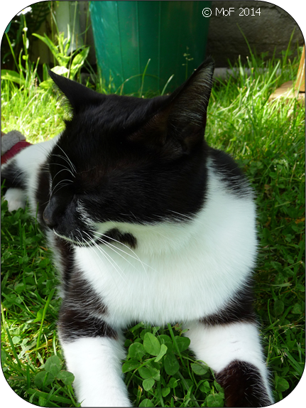 När hon inte är upptagen med jakt, ligger Mia och slumrar, men håller noga koll på reviret. Och på matte. Med ojämna mellanrum dyker hon upp och vill ha full uppmärksamhet. Eller så hoppar hon fram ur nån buske när jag minst anar det. 🙂