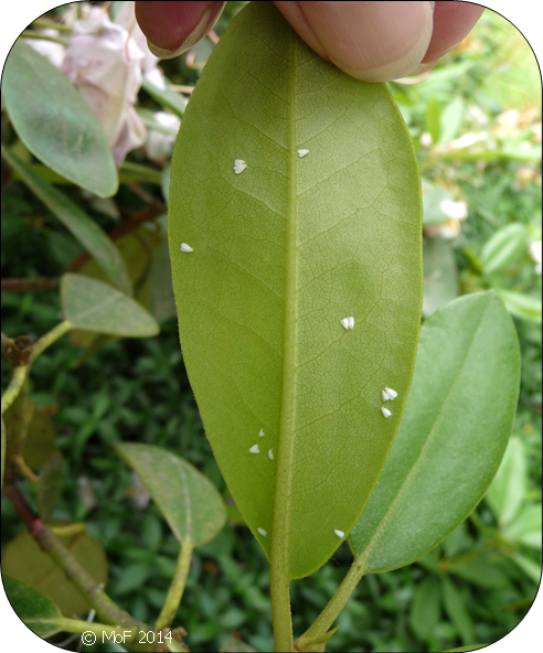 Det är inte bara rosenstriten som frodas. Igår upptäckte jag massvis med vita kryp på rhododendronbusken (klicka på bilden för att se den i större storlek), ett plommonträd har drabbats av ohyra som gör bladen klibbiga och nästan svarta och bladlössen gottar sig på rosorna. Suck.