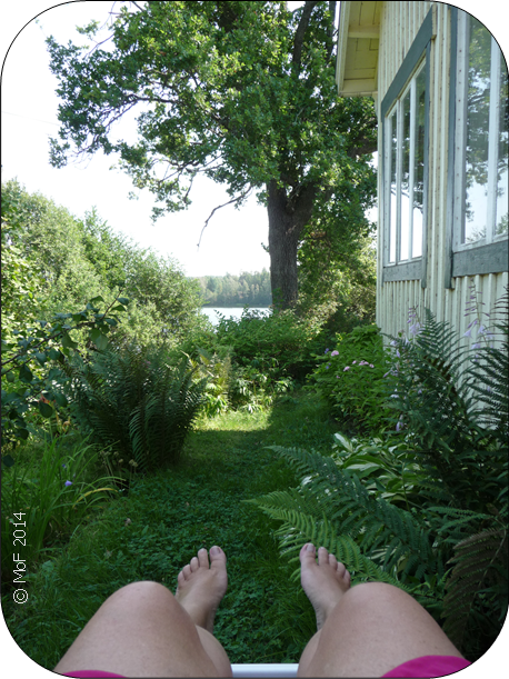 Hon ville gärna börja med kaffe i bersån så vi bänkade oss där med kaffe och glass. Innan vi hade hunnit förflytta oss ner till sjön kom ägaren till datorn jag städade med betalning för arbetet, så han fick göra oss sällskap med en mugg te.