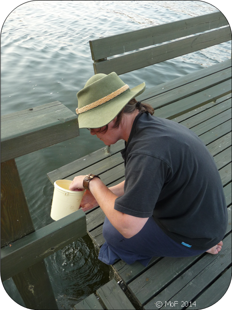 Vid bryggan tog hon ett vattenprov för att jag skulle få veta vad dom gröna ”prickarna” är för nåt. I provkärlet vimlade det också av pyttesmå saker som rörde sig energiskt. Det var vattenloppor (Daphnier) förklarade hon.