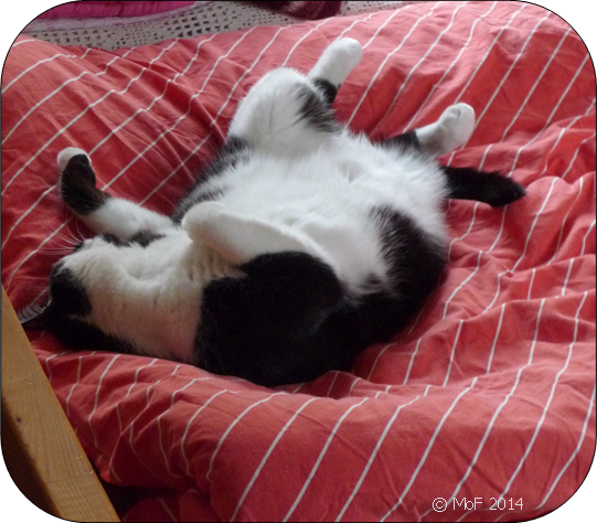 Sen den dallrande hettan avtog är Mia aktiv på dagarna igen och har därför återgått till att sova en hel natt. Hon var visserligen upp vid fyrasnåret och knaprade i sig lite torrfoder men kom tillbaka och la sig efter det. Ända till tio över sju sov vi i morse. Faktiskt var det jag som vaknade först.