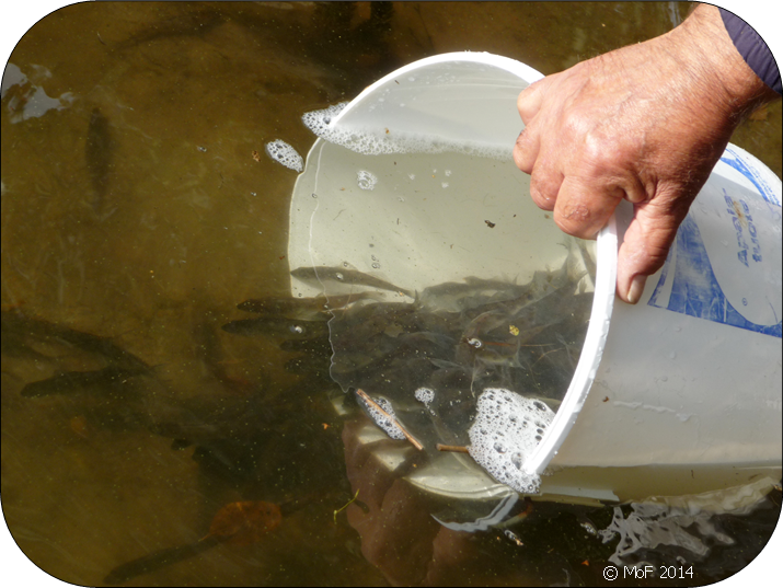 Till vår hjälp hade kontaktpersonen hunnit engagera två personer från f d Dalsbruks sportfiskeklubb så utplanteringen gjordes med vana händer. Dom nästan 10 cm långa fiskbarnen släpptes ut i sakta mak i en strand i Släts (mittemot Ekboms för den som vet var det huset ligger) och redan nästa vecka kommer den slutliga leveransen. Om 3-5 år blir det matfisk av dom små pigga krabaterna under förutsättning att dom överlever.