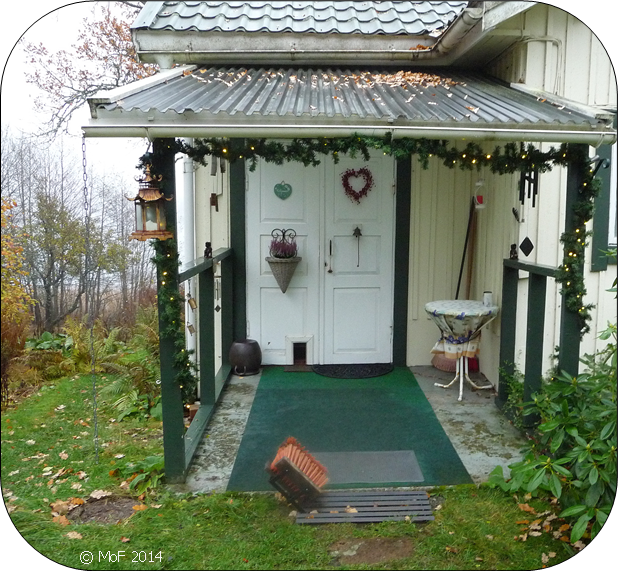Nu är det vintertomt utomhus. Sist av allt tömde jag regntunnan vid trappan och bar in den i boden och skräp-/insektsskyddet hänger på tork i badrummet. Eftersom jag var på ”julhumör” hängde jag också upp ljusslingan ovanför trappan, mest för att slippa göra det när fingrar och elkabel är stelfrusna.