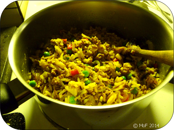 Till en stormhatt för 3-4 personer behövs 400-500 g brynt malet kött (gärna gris+nöt), 2 dl ris, lika mycket stekt lök som kött och 1 (eller 2) påsar djupfrysta grönsaker med ärter, majs, paprika-blandning. Kryddning efter smak och tycke, men i min stormhatt ingår salt, vitlökspeppar, gurkmeja och rejält med färsk, pressad vitlök. Att vitlöken inte ska stekas eller hettas upp hänger i hop med att den då förlorar sina hälsofrämjande egenskaper.