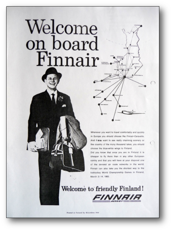 Efter den sorteringen tog jag av bara farten i tu med en tredje tidskriftssamlare som bland annat innehåller delar av ”mitt forna liv” i vårt västra grannland. Där fanns mycket spännande och intressant. Bland annat en kopia på Finnairs reklam från 1964.