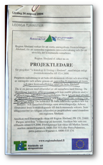 Jobbet i Pargas gällde också en projektledarbefattning, fast med IT-inriktning. Region Åboland sökte en person för att leda projektet e-kunskap Åboland. Projektets målsättning var att ”bidra till ekonomisk tillväxt och utveckling av näringsliv och arbete genom att samordna IT-lösningar på bästa och mest kostnadseffektiva sättet för hela Åboland.”