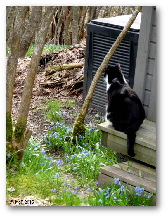 Mia har kommit underfund med att komposthögen är ett bra tillhåll för jakt. Än så länge har jag inte börjat använda dasskomposten, så det finns tidvis ätbart där för Mias jaktbyten. Antingen sitter hon på dasstrappan eller ligger uppe på kompostbehållaren.