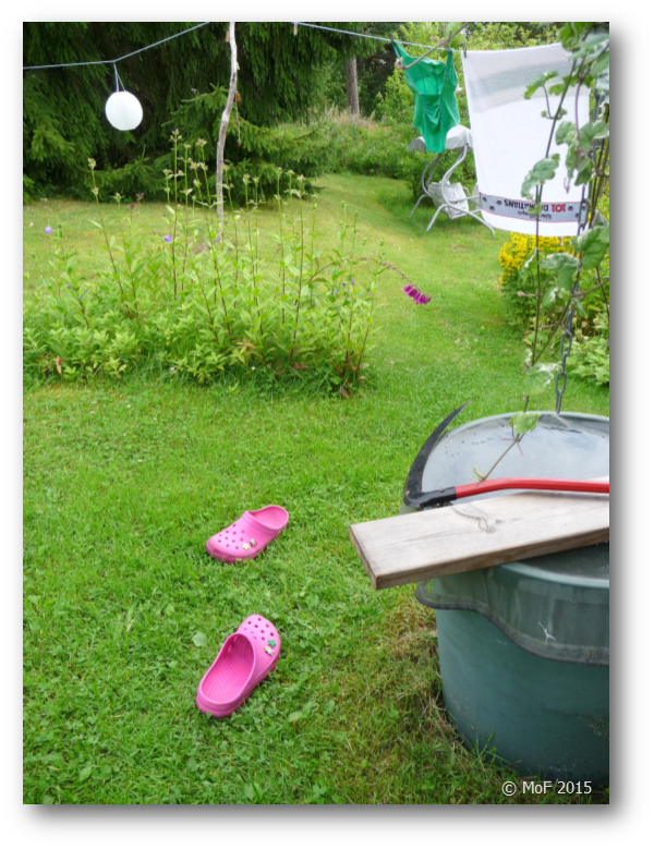 22 mm hittade jag i regnmätaren i morse. Dessutom hittade jag allt jag hade glömt ta in igår kväll – lien, dojorna och badhandduken. 😀