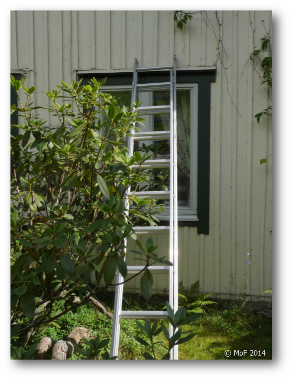 Brandstegen som finns på husets östra sida är ju bra för att ta sig upp, men eftersom den står helt rakt är jag tvungen att hålla i mig med en hand för att känna mig säker när jag står uppe på den, vilket innebär att jag är enhänt när jag ska tömma rännan.
