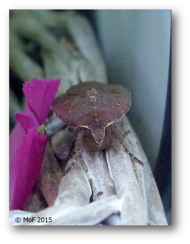 Den här blyga filuren hade idag parkerat på kanten av korgen till inkaliljan. En fjäril av nåt slag, men för mig okänd art. Blygheten var dock inget hinder för att låta sig fotograferas. 🙂