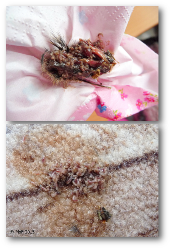 Det är inte mycket jag tycker är äckligt, men inälvsparasiter och maggots hör definitivt till den kategorin. I förmiddags hade Mia fångat en sork och tagit ett bett av huv’et – som kryllade av mask… Av fläcken på mattan att döma och allt som rörde sig på den kräktes hon upp det hon hade hunnit svälja. Dödsäckligt. 😦