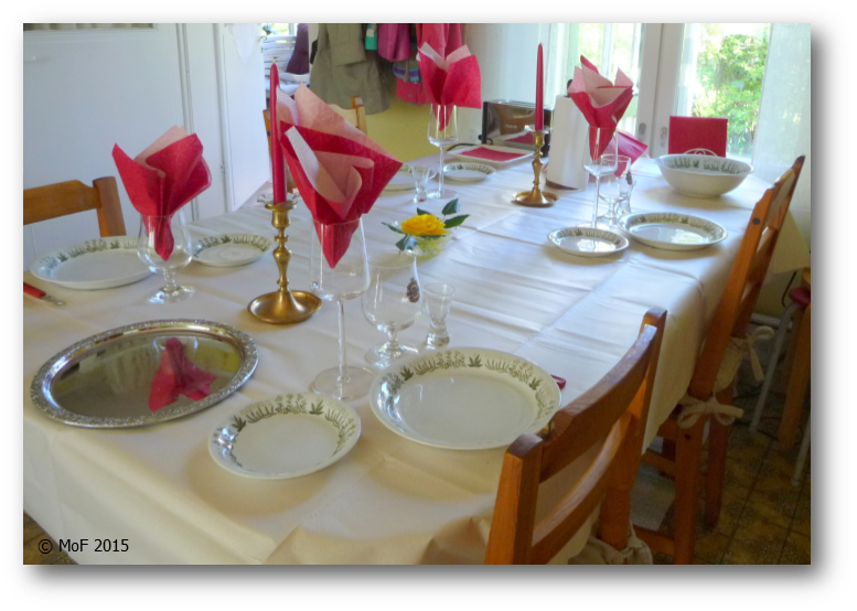 Vid halv fyra igår stod bordet dukat. Det enda som fattades var kräftfatet och de välkylda dryckerna. Men efter en inledande apéritif enligt mormors ”recept” ställdes dom givetvis fram. Kräftskivan kunde börja.
