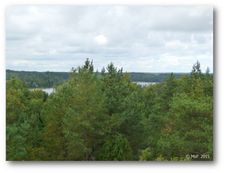 Eftersom fastigheten ligger på den högst belägna punkten i byn, tog vi en titt på den omgivande vyn. Den består mest av gröna trädtoppar numera, men mellan dom kan man se en glimt av sjön. Husen nedan­för syns inte alls längre. Men som bekant är förändring det enda som är konstant.