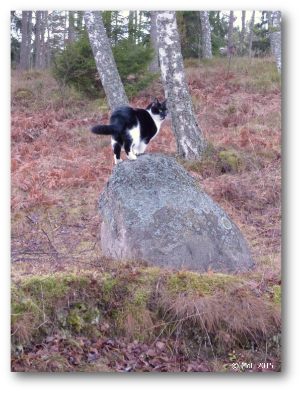På den tiden vi avverkade promenadsträckan hade man hunnit många varv runt byn. Ibland stannade Mia för att lyssna och speja och ibland stannade jag vid lämpliga bildmotiv. När solen hade försvunnit bakom trädtopparna började det kännas riktigt kallt, så hemvägen gick i ganska snabb takt med bara ett par stopp.