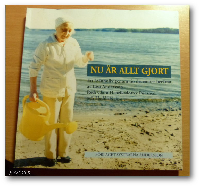 Tant Lisas döttrar har efter hennes död skrivit en bok som bygger på Lisas egna anteckningar under åren: ”Nu är allt gjort”, utgiven på eget förlag (Förlaget Systrarna Andersson) 2015. Boken fick jag låna av fru grannen för ett tag sen och nu har jag läst den.