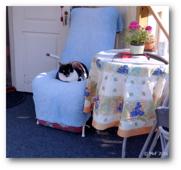 När jag ändå var i farten, ställde jag också fram sommarbordet och min sommarstol på trappan. Det tyckte Mia var en utmärkt idé, hon annekterade den omedelbums. Efter en kort förhandling fick jag låna den i ungefär en kvart medan hon hade annat för sig. 🙂