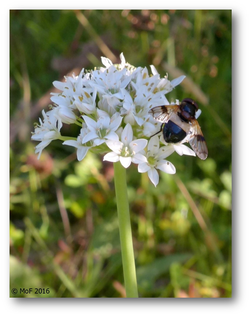 Enligt boken Småkryp (av Åke Sandhall) är den här Blomflugan (Volucella pellucens) vanlig, men på Udden har jag aldrig upptäckt den förrän idag. På sajten Småkryp heter den däremot Fönster­blom­fluga ser jag. En maffig liten sak som botaniserade på pryd­nads­löken. 🙂