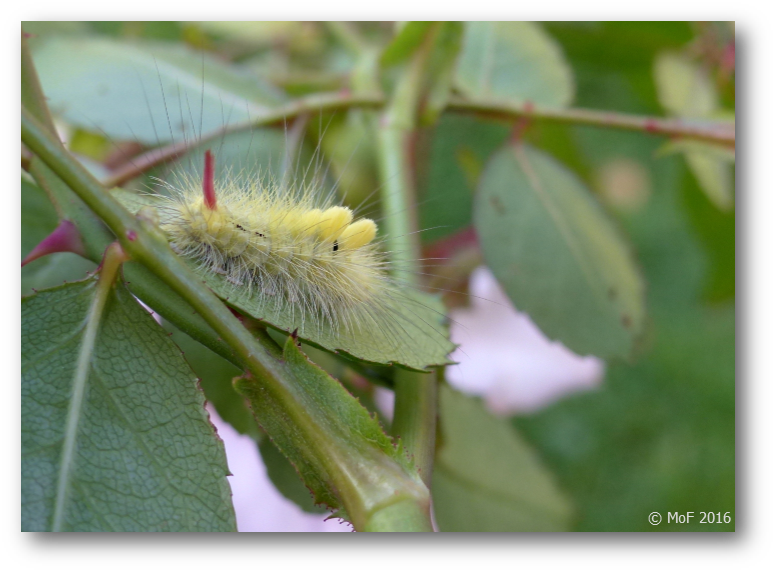 I eftermiddags blev jag bekant med en läcker liten kompis som satt på undersidan av ett rosenblad. En bokspinnare ska det bli av den så småningom har jag läst mig till. 🙂