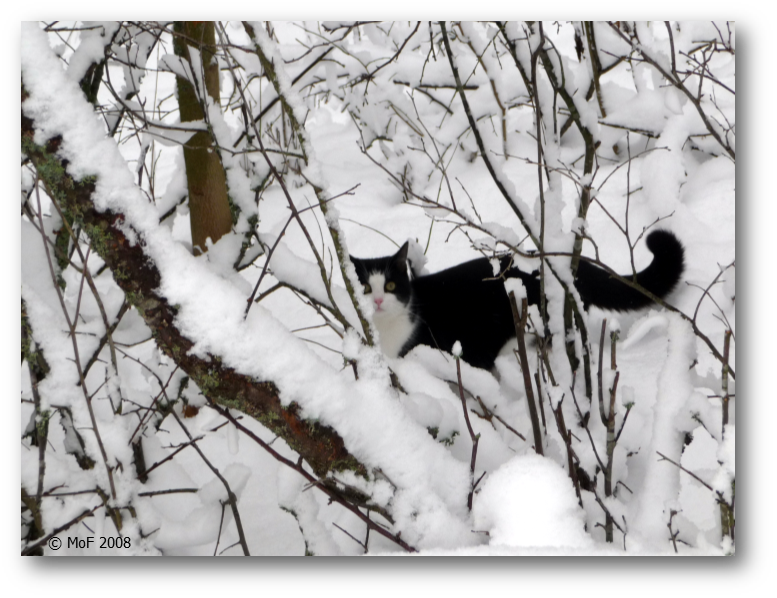 Idag halkade jag in på mina bilder från 2008 och hittade en på Snuttan från den 25.11. Hon var ursprungligen vildkatt men blev efter idog träning huskatt. Fast aldrig lika social som Mia, som är född i en ladugård och van vid människor från födseln. 🙂