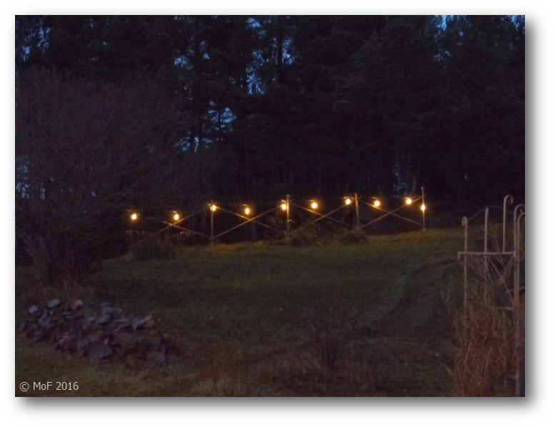 Idag kom ljusslingan på plats vid trappan, men ”snöflingorna” jag köpte härom året beslöt jag skippa. Sen kom jag på en bokstavligen lysande idé: Dom kunde ju passa på mitt s k staket!