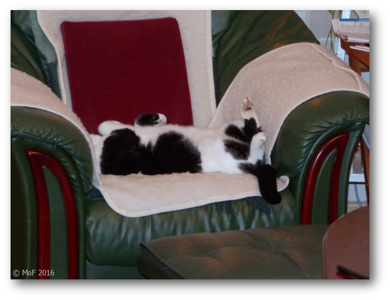 Så länge det var snö och kallt ute, så gott som vägrade Mia att vistas utomhus annat än för att uträtta sina behov. Det hände för all del också flera gånger att hon nyttjade sin innetoa. Däremellan sov eller chillade hon på sina favoritställen. Den konsten kan hon, som alla katter. 🙂