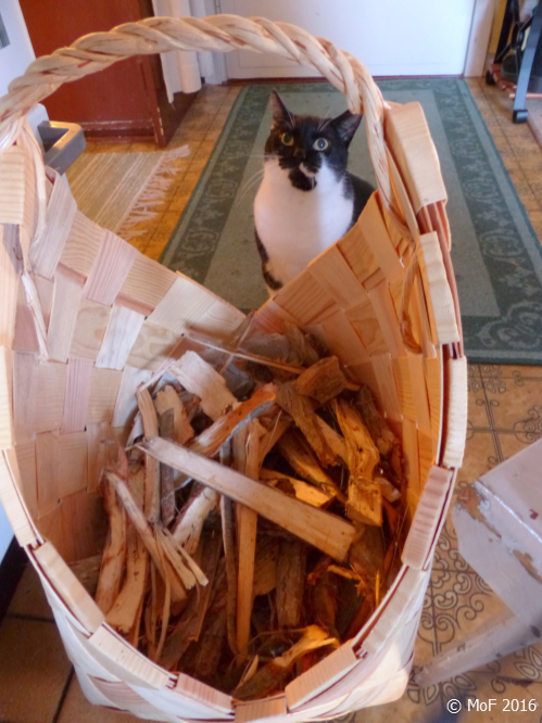 Nu när det är plusgrader igen nöjer jag mig med s k lättved, dvs vedflisor från senaste vedleveransen som jag krattade ihop sedan veden var inforslad. Dom betalade jag ju faktiskt lika mycket för som för vedträna. Mia ser dock ut som om hon ifrågasätter mattes val. 🙂
