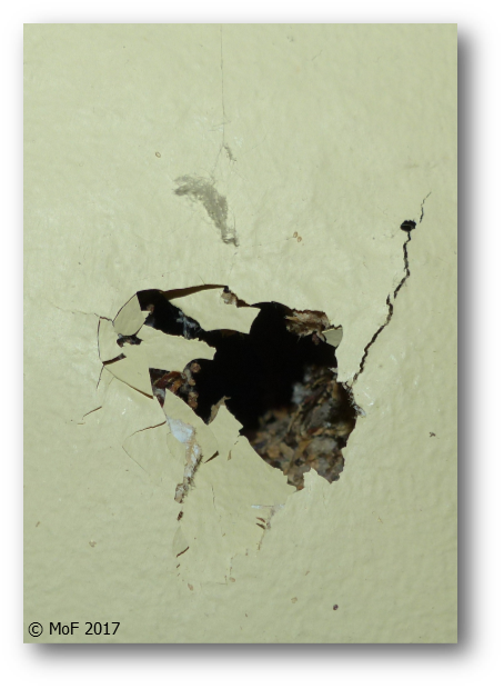 Härom kvällen upptäckte jag en svart blaffa på väggen ovanför kylskåpet och försökte skrapa loss den med en lång linjal. Det gick inge’ bra. Det visade sig att blaffan är ett hål i den målade väggpappen!