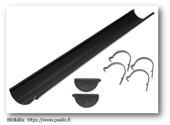 För nån vecka sen upptäckte vi att det var extrapris på tre meters takränna hos Puuilo och beslöt slå till. Uthuset har nämligen hittills haft två gamla rännor, en i plåt och en i plast, som bara räckte till för att skydda ingången till vedlidret.
