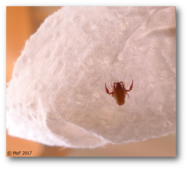Ah, vilken lycka! Idag hade jag turen att fånga en livs levande bokskorpion på bild. Hittills har jag bara hittat döda exemplar i gamla böcker, så det var en glad överraskning att upptäcka den på ett kakel ovanför spisen. Varsamt förflyttade jag den till en bit hushållspapper. 🙂