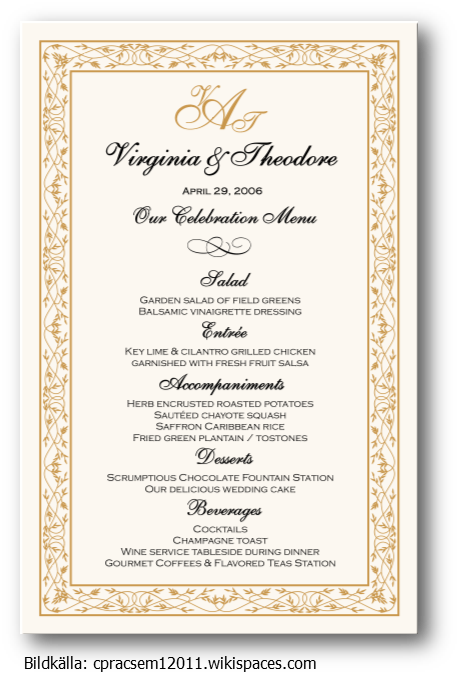 Förrätt, mellanrätt, två varmrätter, dessert och kaffe plus diverse tillbehör torde se till att gästerna blir mätta. Nu återstår bara att skapa en meny i tilltalande design. 🙂