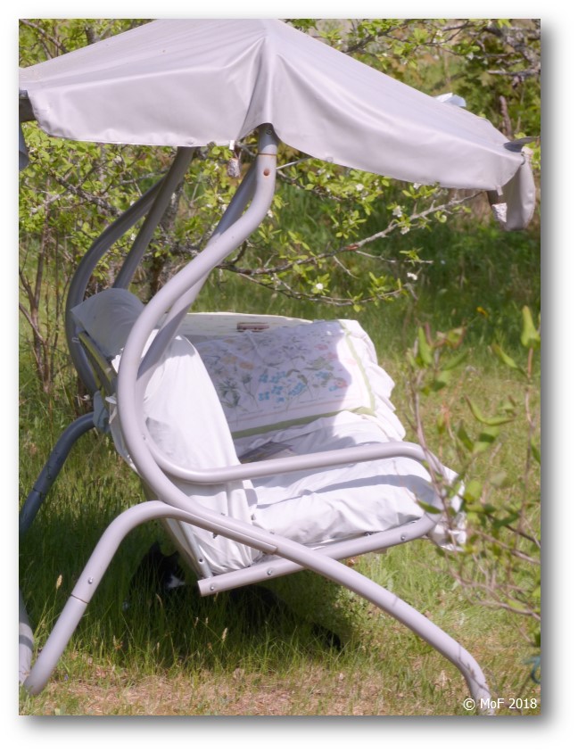 En läs‑/sovstund i hammocken hägrade på eftermiddagen. Det krävde att jag först försåg den med sommarbeklädnad innan jag parkerade mig i den med ”Den sista kejsarinnan av Kina”. Mia tyckte det var en bra idé och placerade sig på min mage.