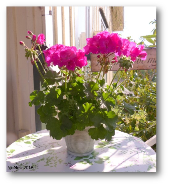 I söndags hade vi kaffegäster på eftermiddagen och självfallet satt vi i bersån. Med sig hade gästerna en pelargon i en av mina älsklingsfärger.
