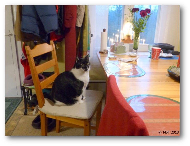 Om Mia upptäcker en utdragen stol tar hon genast chansen i förhoppning om att bli serverad.