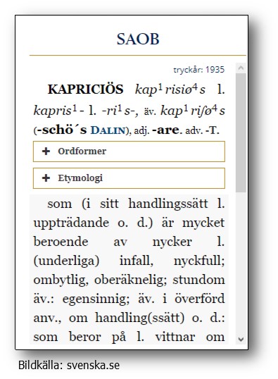 Ett av dagens ord var kapris, adjektivet är kapriciös. Som den självutnämnda språkpolis jag är, har jag så klart en genväg till svenska.se, där man kan söka i tre ordböcker samtidigt.