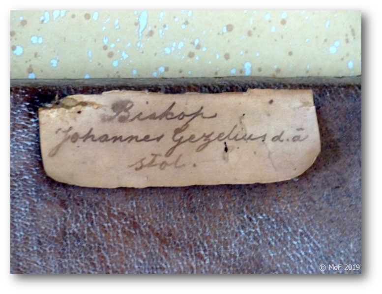 Längst fram i lärosalen tronade biskop Johannes Gezelius d.ä. (1615-1690) stol, ditflyttad från en av gårdarna på ön där man höll läsförhör. Han blev biskop i Åbo 1664.