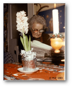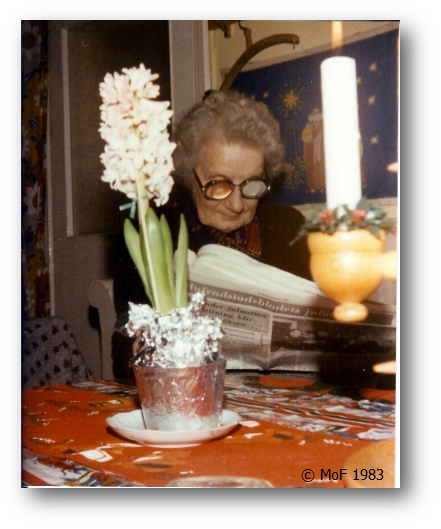 I morgon är det den 28.10. Om min fostermor levde skulle hon fylla 112. Bilden togs julen 1983, hon var då 76 år. Jag har också haft en bild på henne när hon fyllde 91, men den har jag slängt. På den var hon inte längre sig själv upplevde jag. Demensen hade satt sina spår. Den 21 januari 1999 dog hon.